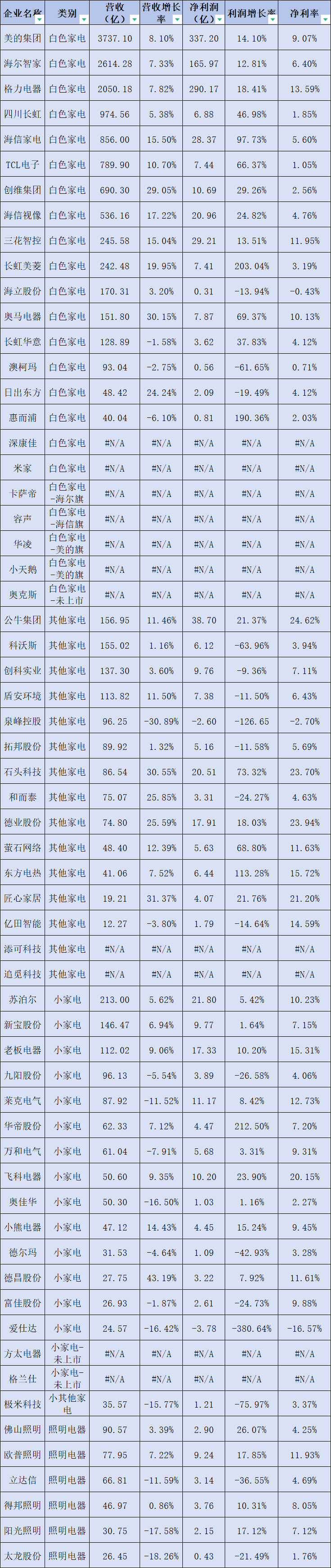 白色家电板块,整体业绩表现较好,营收前十强企业营收和净利润均实现正增长,营收增长率均不低于7%,净利润增长率均不低于10%。美的集团、海尔智家,格力电器营收均超2000亿元。小家电板块,业绩表现参差不齐,50%的企业营收实现正增长,超70%的企业净利润实现正增长。苏泊尔、新宝股份、老板电器营收和净利润均实现正增长。