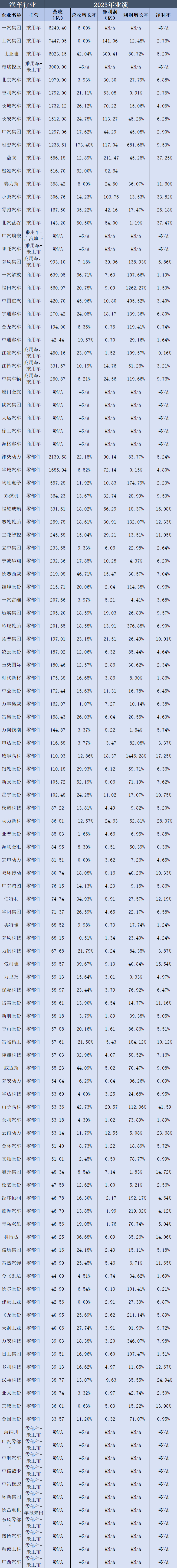乘用车板块中,所有企业营收均实现正增长,净利润表现参差不齐。营收最高的三家企业分别为一汽集团、上汽集团和比亚迪。净利润较高的企业有上汽集团、一汽集团、比亚迪、长安汽车和理想汽车,净利润均超100亿元。净利润亏损超50亿元的有蔚来汽车、小鹏汽车、极氪汽车、北汽蓝谷。商用车板块除中通客车外,其余企业营收均实现正增长,除东风汽车和中通客车外,所有企业净利润均实现正增长,但净利率水平均不高。汽车零部件板块75家上市企业中,65家企业营收和净利润实现正增长,占比86.66%,业绩较2022年明显提升,整体表现较好。