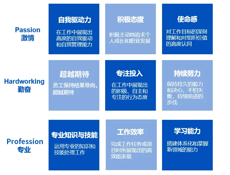 Passion(激情)——激情就是指你不管在什么样的过程中,在什么样的状态下。对工作都有一种忠心的、强烈的、真实的、兴奋的感觉。永远会向目标去迈进。包含三个层面的含义:Aspiration(抱负)、Positive(积极活力)、Incentive(激励)。员工必须充满了抱负,而并非没有梦想;充满活力,不会满足于现状,总是在生长的状态,正是因为这样的状态,就会让整个团队都充满活力;激励他人的能力,激励别人是领导最重要的工作。哈佛大学的教授约翰科特就认为,一个复杂企业组织领导分为三个部分。确定企业的经营方向,联合群众以及激励和鼓舞。这也许是最被忽视的因素。用来评估一个人的动力和欲望,以匹配可能越来越高的责任与形象。