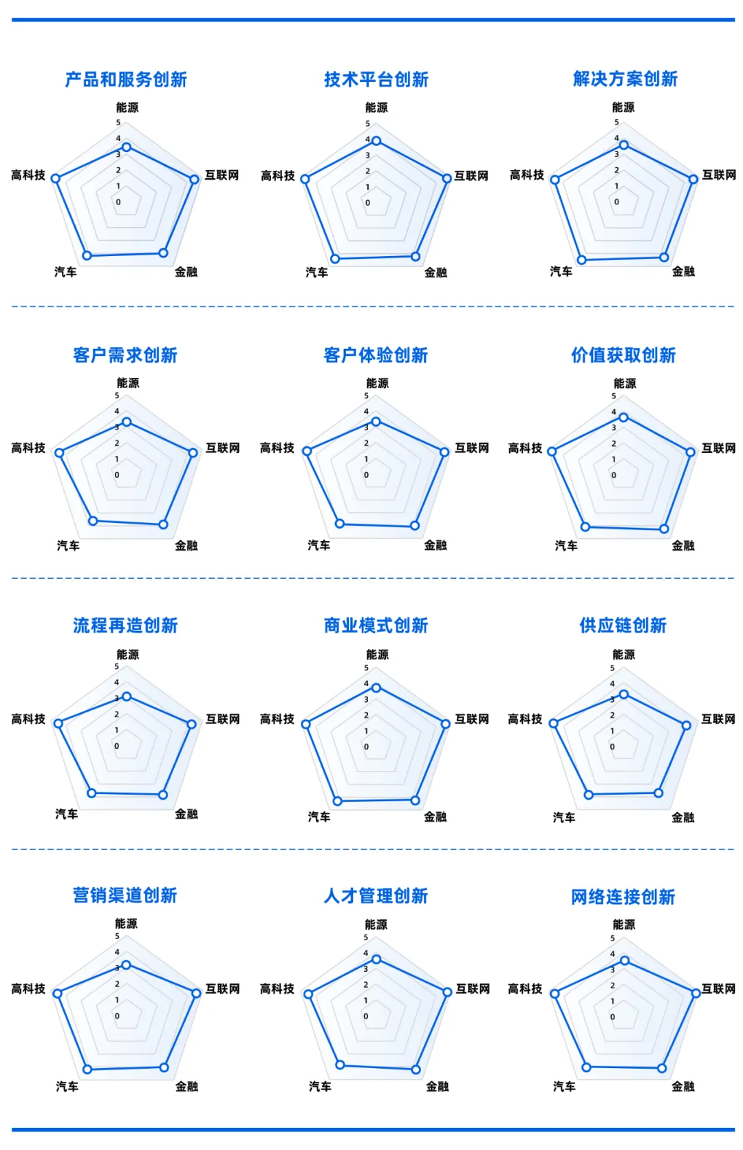 管理创新则是指组织形成创造性思想并将其转换为有用的产品、服务或作业方法的过程。也即,富有创造力的组织能够不断地将创造性思想转变为某种有用的结果。在新质生产力的驱动下,佩信行业研究院凭借佩信集团专业的行业数据和深入的市场洞察,开发了一套企业创新方向的评估工具——企业创新方向12矩阵雷达图,是衡量和导航企业创新战略的重要工具,旨在为企业提供一种全面、多维度评估方法,帮助企业识别在以下领域的创新能力和发展潜力。以下是构建12矩阵雷达图的筛选标准。佩信集团萃取佩信萃取能源、汽车、金融、高科技、互联网等行业数字化人才服务方面的经验为基础,结合行业洞察和专业数据,构建五大行业的企业创新12矩阵雷达图,旨在帮助五大行业了解当前的创新状况,为企业未来的创新路径提供指导,助力其在激烈的市场竞争中保持领先地位,实现可持续创新发展。