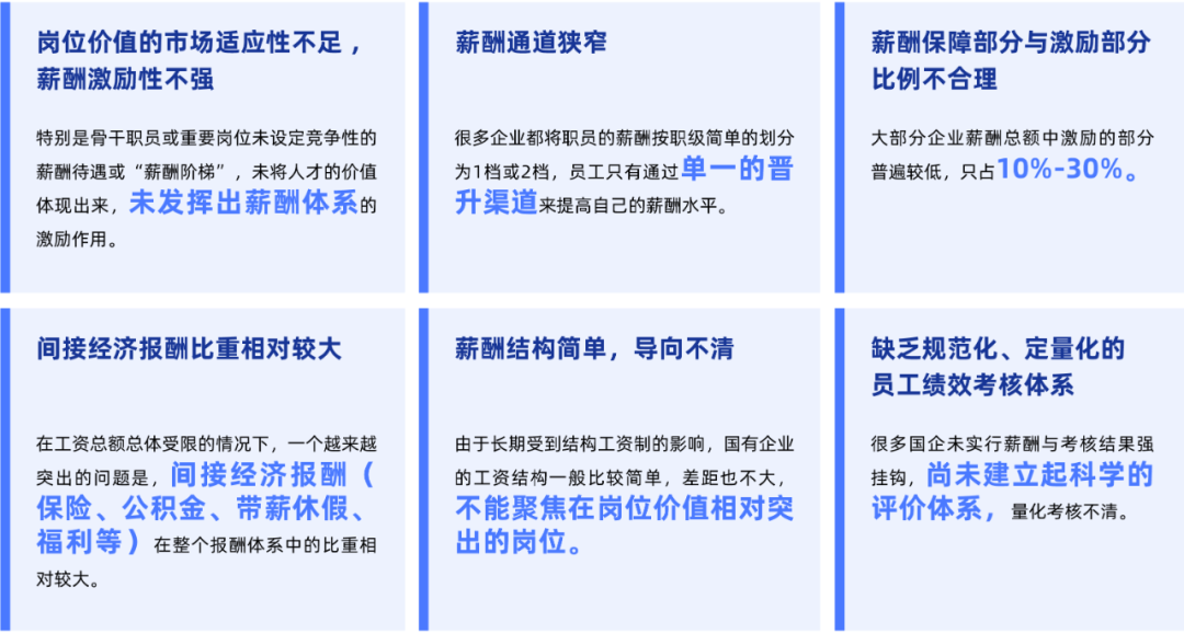 具体来看,大部分央国企未将薪酬策略与企业经营战略进行挂钩。有的虽进行了挂钩,但当企业发展阶段发生变化、经营战略发生变化后,薪酬制度并未同步调整。此外,大部分央国企未建立科学的岗位评价和职级评定体系。